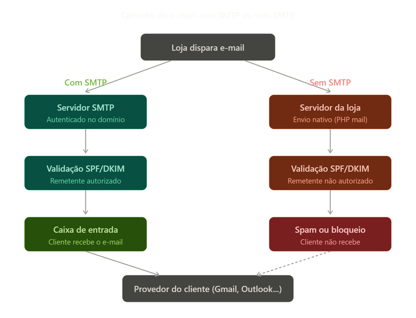 O diagrama abaixo ilustra o caminho que o e-mail da sua loja percorre até chegar ao cliente — e por que, sem um SMTP configurado, esse caminho quase sempre termina no spam.