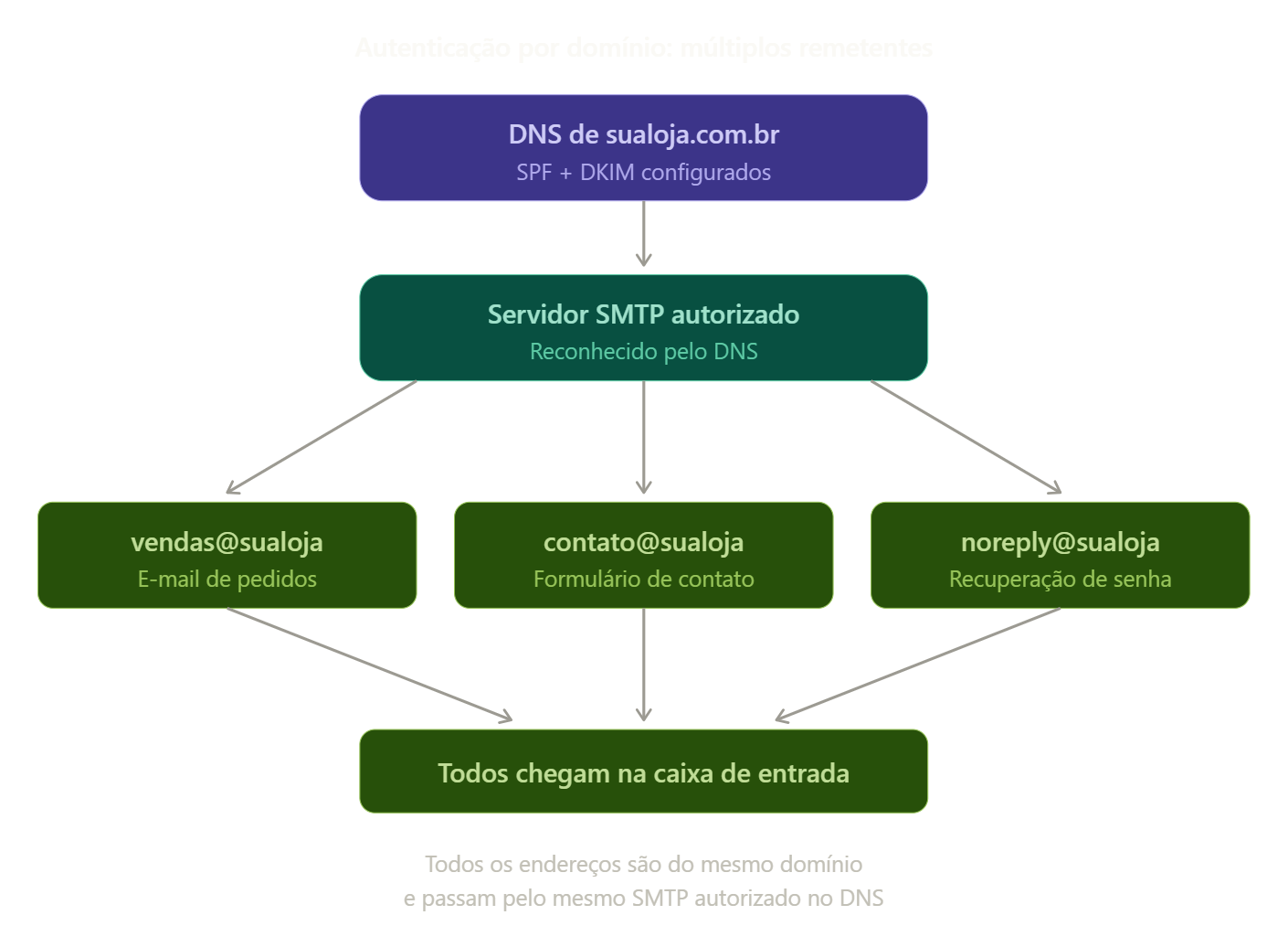 É possível utilizar endereços diferentes para funções diferentes — por exemplo, vendas@sualoja.com.br para e-mails de pedido, contato@sualoja.com.br para o formulário de contato e noreply@sualoja.com.br para recuperação de senha — desde que todos pertençam ao mesmo domínio e que esse domínio esteja com as autenticações de segurança (SPF e DKIM) corretamente configuradas no DNS. Veja abaixo como diferentes endereços do mesmo domínio podem ser usados na loja sem comprometer a entrega, desde que todos passem pelo mesmo servidor SMTP autenticado.