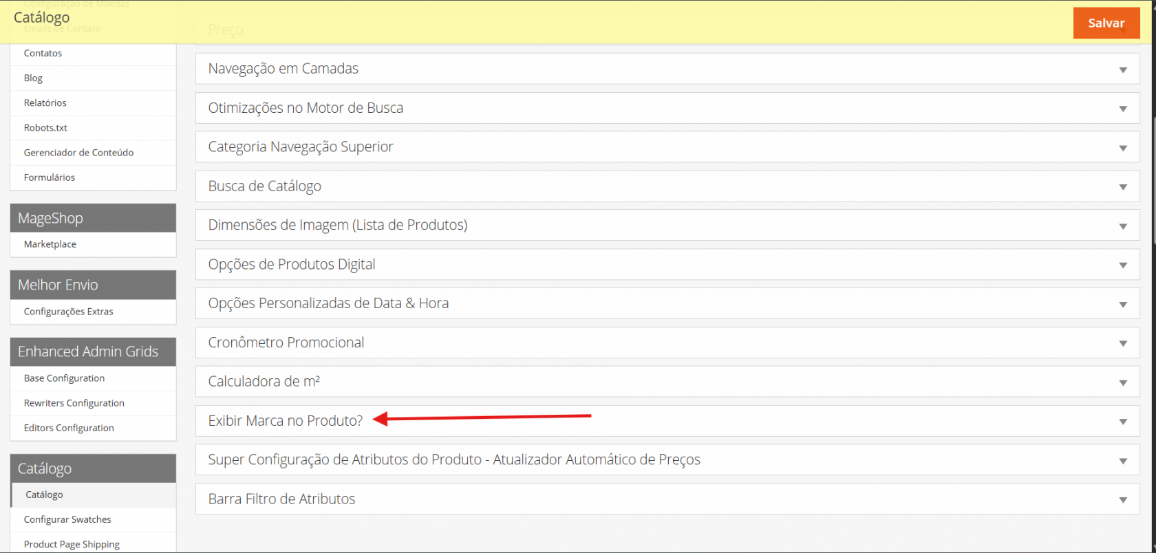 Para acessar as configurações do módulo de Exibir a Marca na Página do Próduto, acesse no painel adminitrativo da sua loja Magento 1 open mage. No menu superior vá em "Sistema > Configurações > Catálogo (menu lateral) > Catálogo" e abra a opção de "Exibir Marca no Produto". Conforme as imagens abaixo: