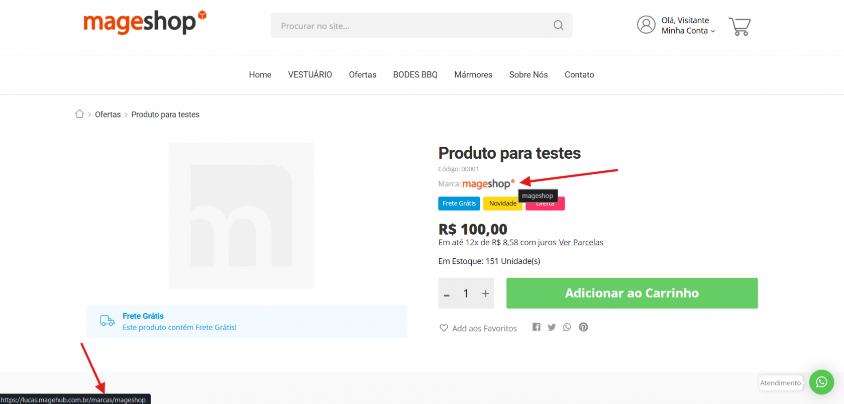 - Confirme a Exibição: A marca do produto deve estar visível logo abaixo do título do produto, conforme as configurações feitas.