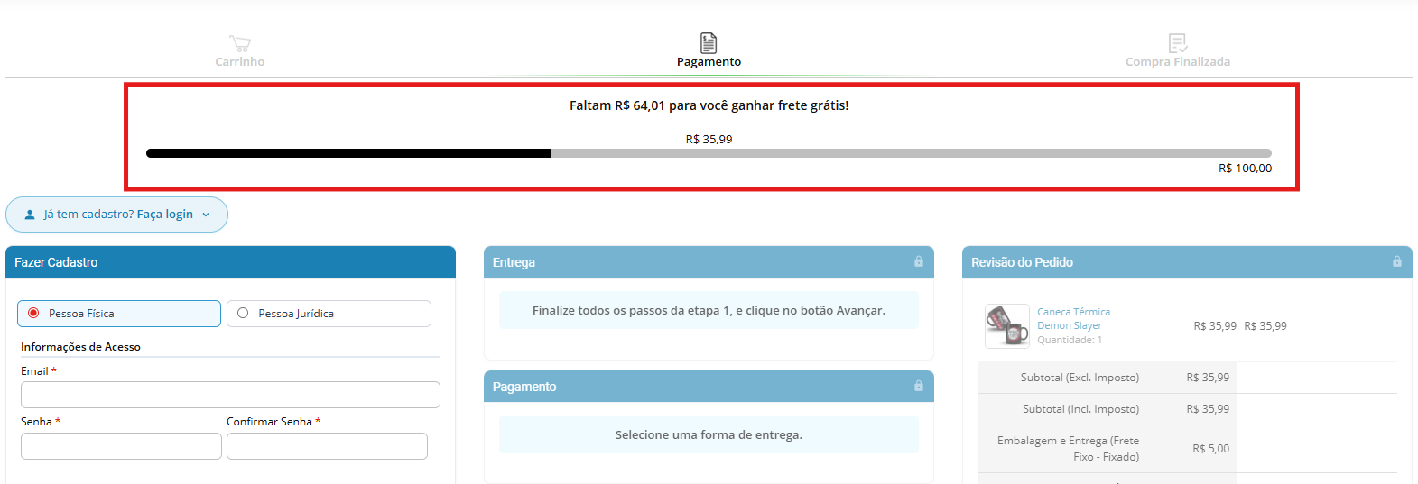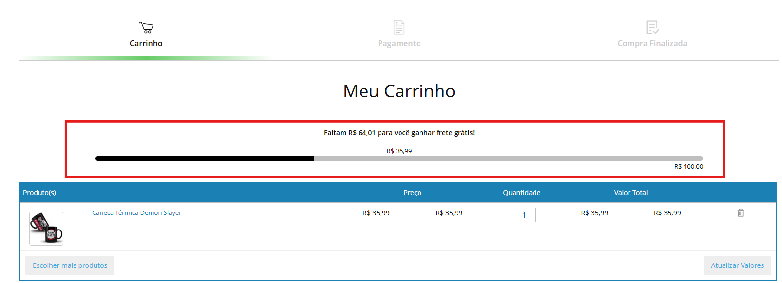 O módulo Barra de Frete Grátis adiciona uma barra visual no carrinho e checkout que mostra quanto falta para o cliente ganhar frete grátis.