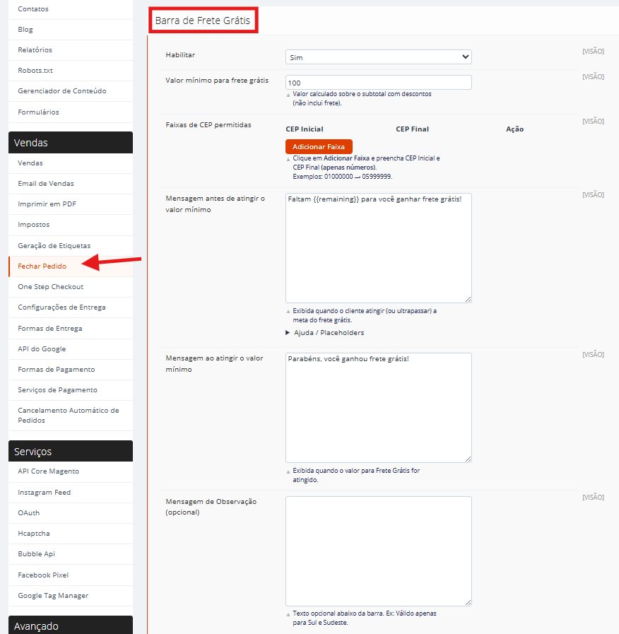 Sistema → Configuração → Vendas → Fechar Pedido → Barra de Frete Grátis