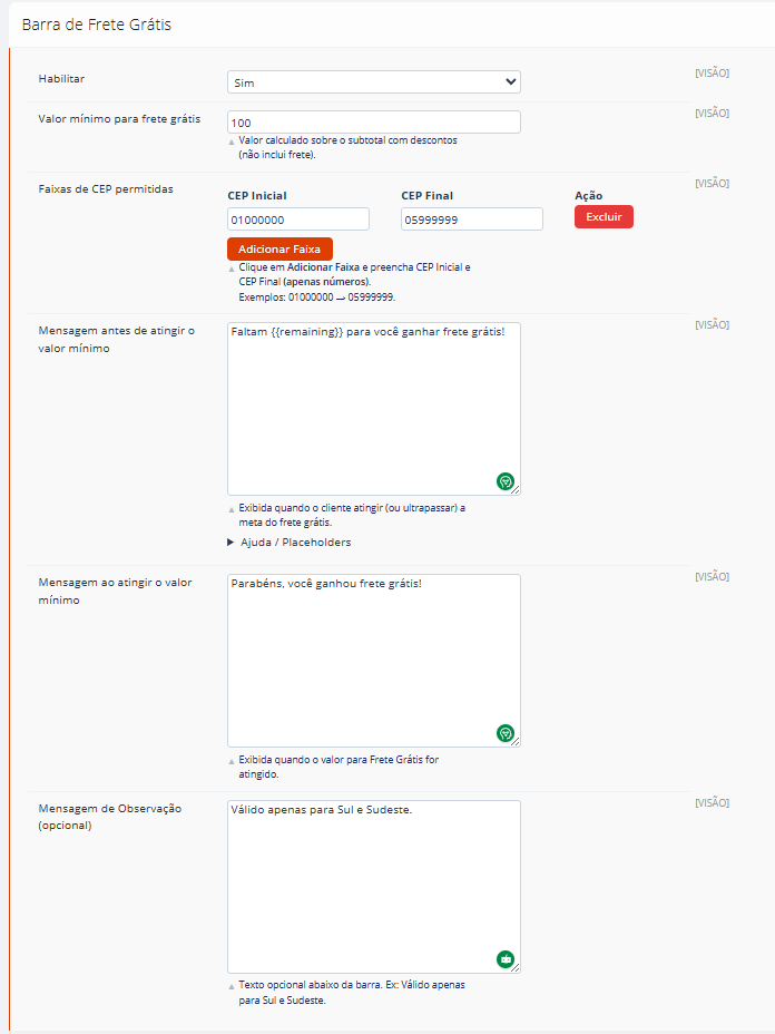 Permite restringir o frete grátis por região. Exemplo de preenchimento: