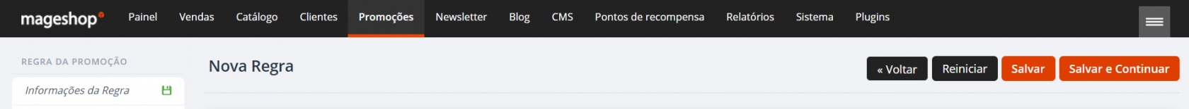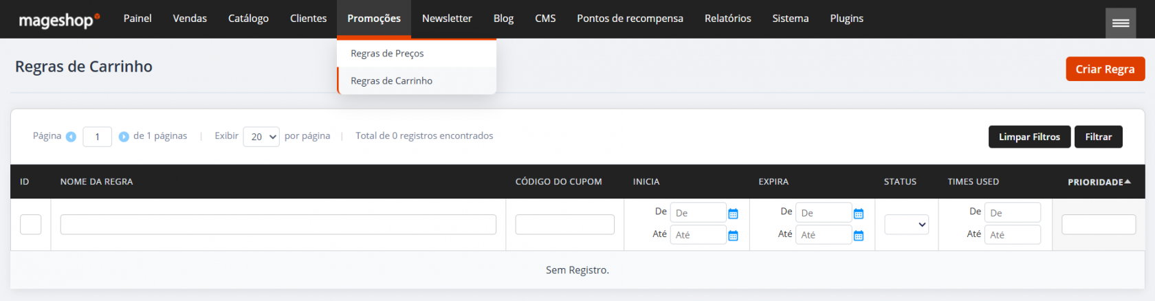 No painel administrativo da loja virtua, no menu superior acesse Promoções > Regras de Carrinho e clique em Criar Regra (botão laranja a direita).