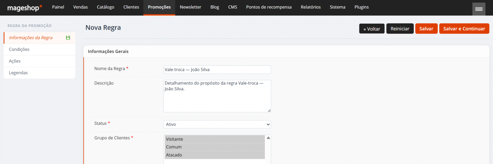 | Nome da regra | Preencha com um nome que identifique facilmente o vale-troca (ex: "Vale-troca — João Silva"). |