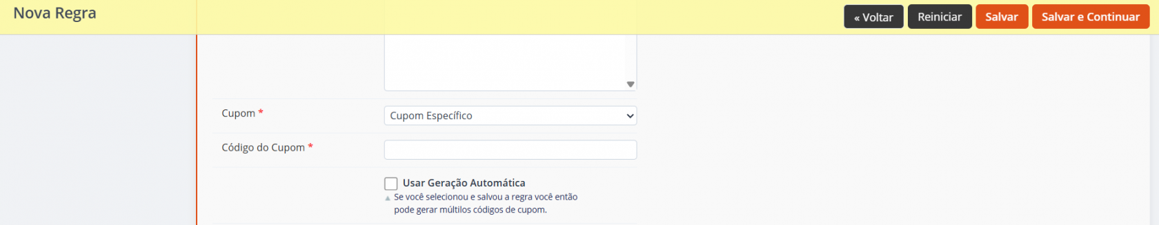 | Usar geração automática | Mantenha esta opção desmarcada. Ela permite gerar múltiplos códigos de cupom vinculados à mesma regra, o que é útil para campanhas em massa, mas não se aplica ao vale-troca. Para vale-troca, o correto é definir um único código manualmente no campo acima. |
