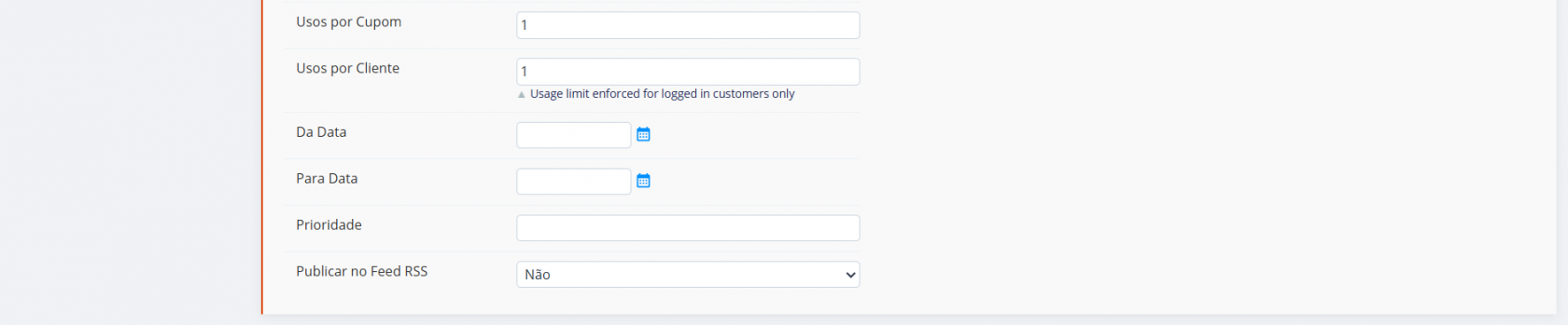 | Publicar no Feed RSS | Selecione Não. Esta opção divulga o cupom no feed RSS público da loja, tornando-o visível para sites agregadores de cupons e qualquer visitante. Como o vale-troca é destinado a um cliente específico, ele não deve ser publicado. |