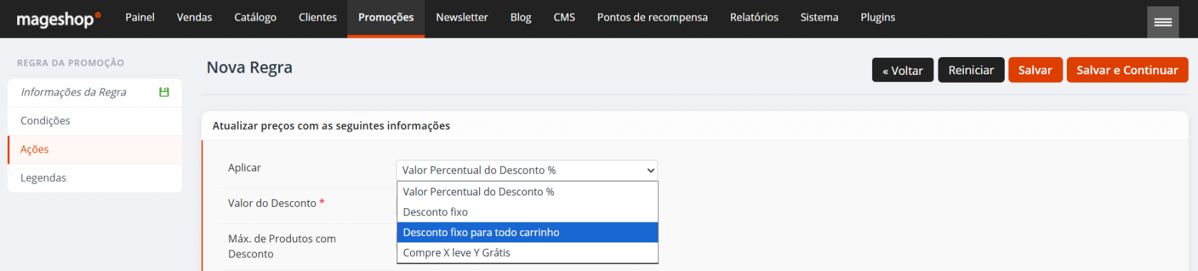 Selecione Desconto fixo para todo o carrinho. Esta opção aplica um valor fixo em reais sobre o total do carrinho, sendo o modelo correto para vale-troca. As demais opções disponíveis são: