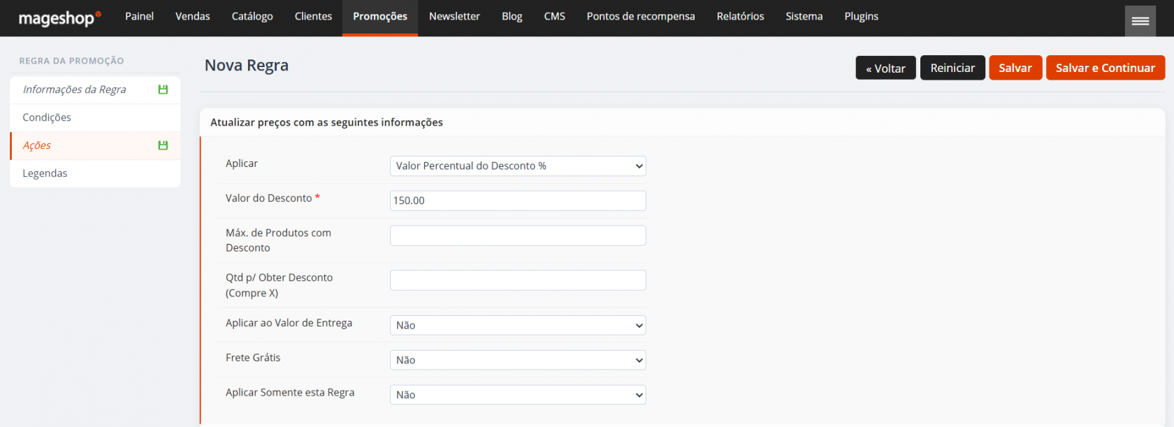 Caso o cupom não seja aceito logo após a criação, verifique se o Status da regra está definido como Ativo e se a data de validade está dentro do período configurado.