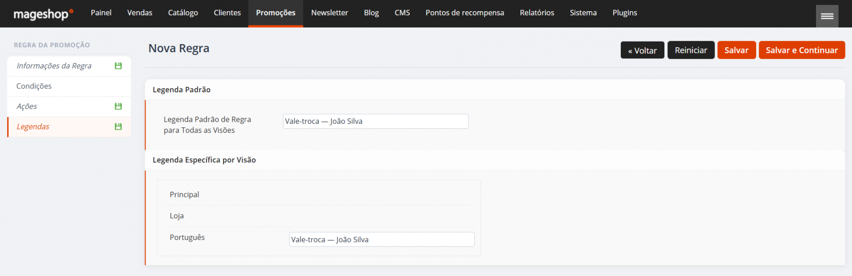 Permite definir um texto diferente para cada visão de loja (ex: loja em português e loja em espanhol). Se preenchido, sobrepõe a legenda padrão naquela visão específica. Para lojas com uma única visão, pode ser deixado em branco. |