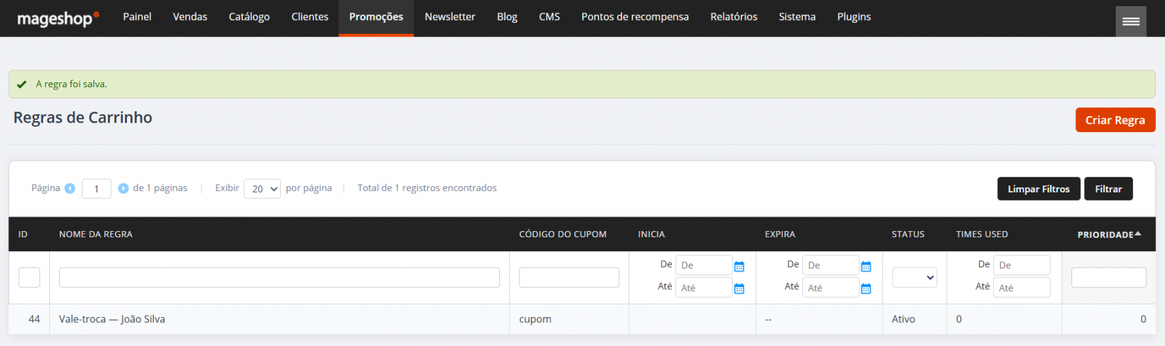 Após salvar, a mensagem "A regra foi salva" irá exibir no topo da página e regra aparecerá na listagem de Regras de Carrinho com o status Ativo.
