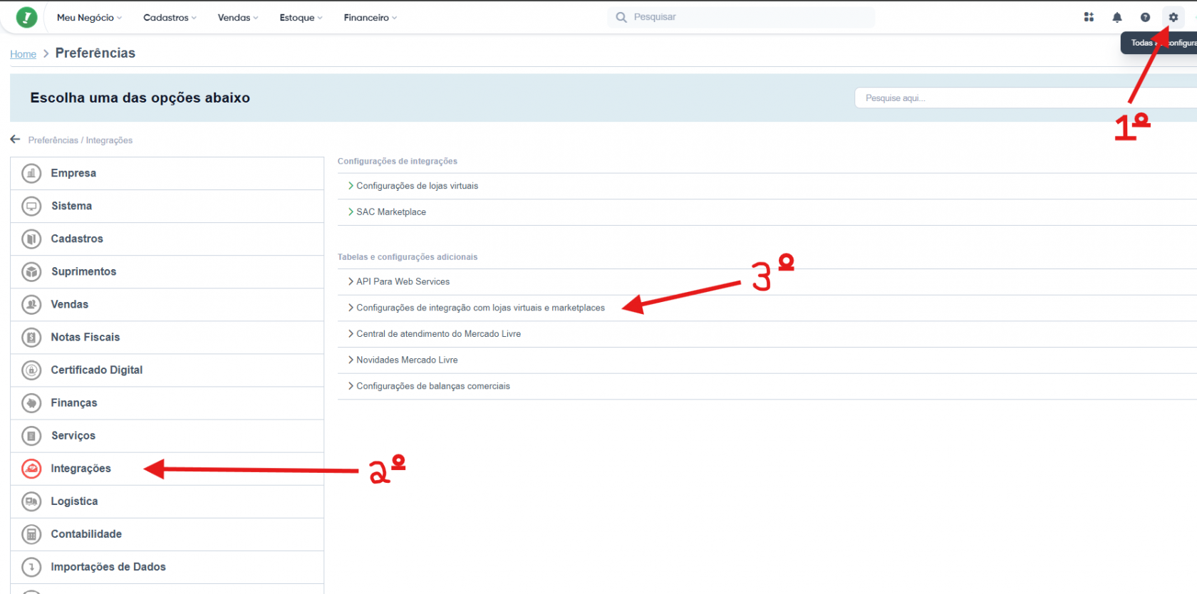 Acesse sua conta Bling > clique na engrenagem > Integrações > Configurações de integração com lojas virtuais e marketplaces