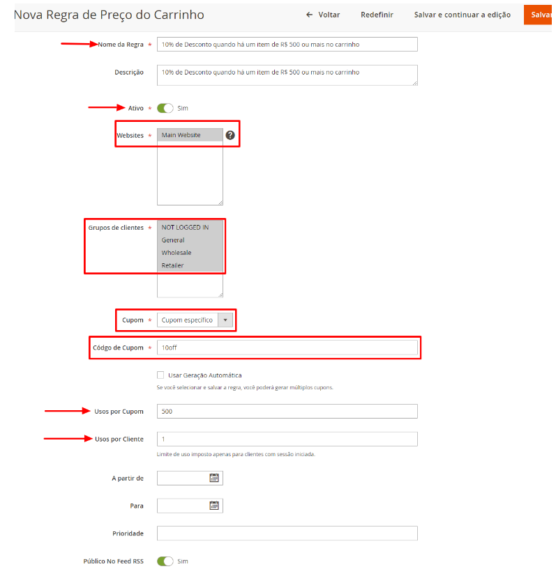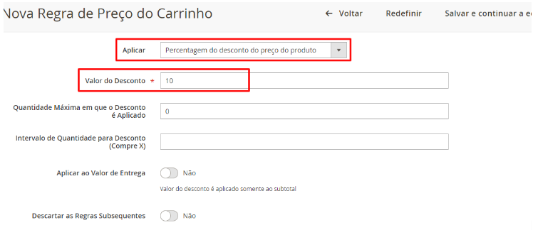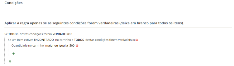 Obs: Esta configuração acima, irá aplicar 10% de desconto em cada produto no carrinho, desde que esteja presente ao menos um produto que custe R$500,00 ou mais.