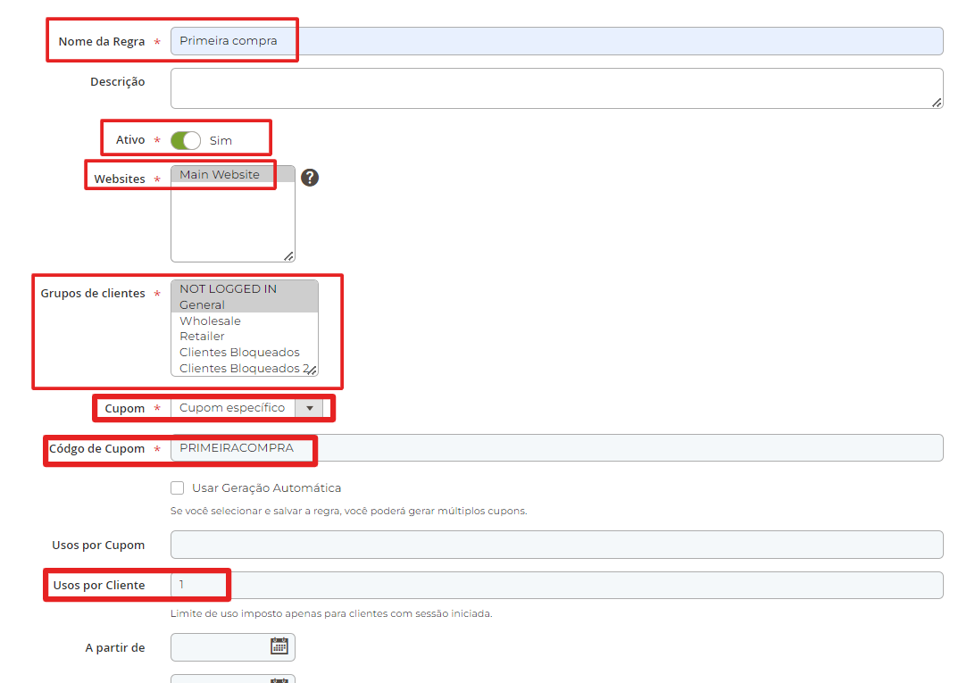 2.1.2 - Vamos usar um código de cupom específico para esta regra. No campo “Cupom” selecione “Cupom Específico” e informe o código “PRIMEIRACOMPRA".