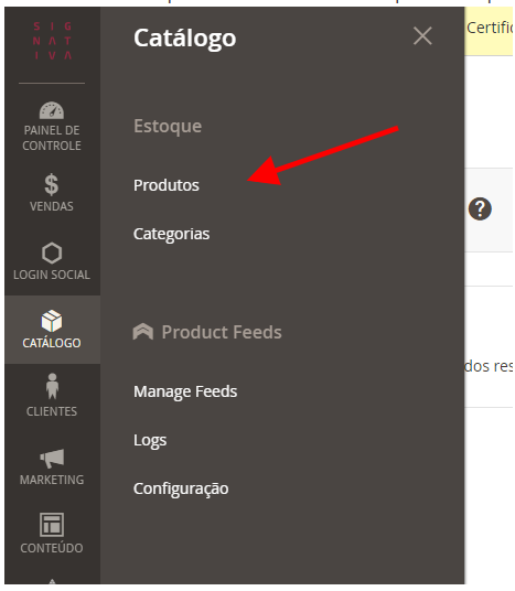 1.3 - Também é possível encontrar a URL do produto via painel administrativo, para isso acesse seu painel e vá em Catálogo > Produtos