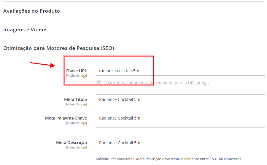 1.5 - Procure pela guia Otimização para motores de pesquisa (SEO) e no campo Chave de URL copie todo o conteúdo para depois juntar com a URL de sua loja por exemplo: (www.loja.com.br/ COLE AQUI A URL DO PRODUTO copiada )