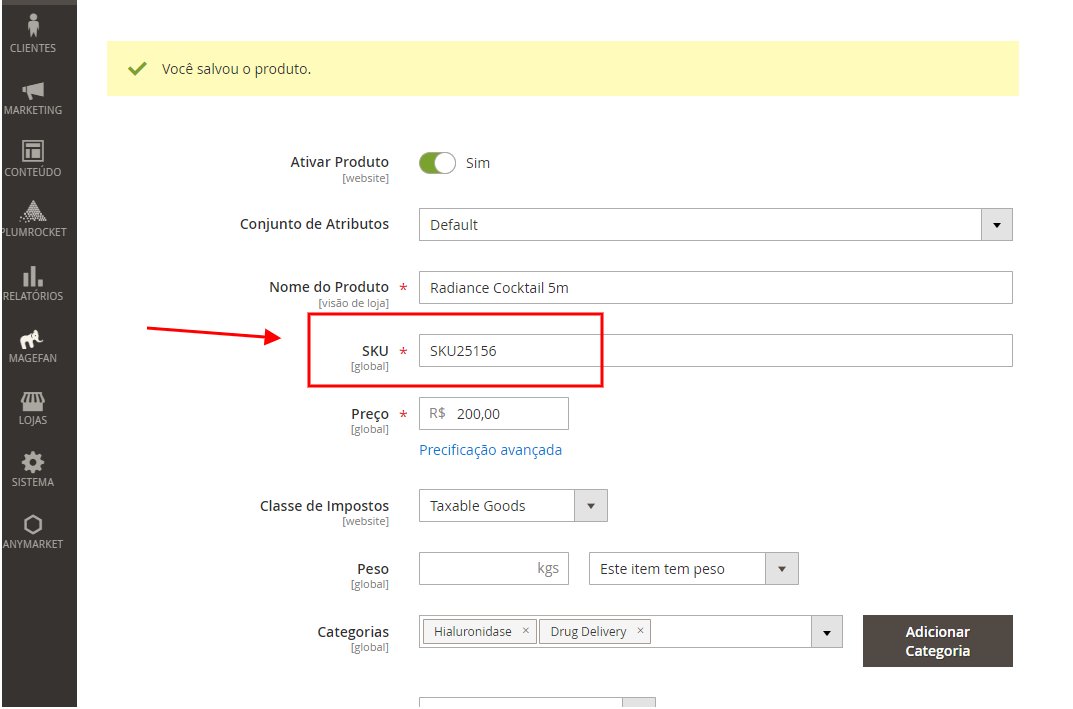 1.6 - Na guia principal do produto ao abrir via painel procure pelo campo SKU