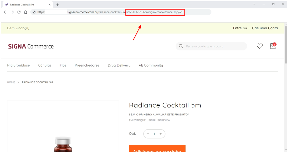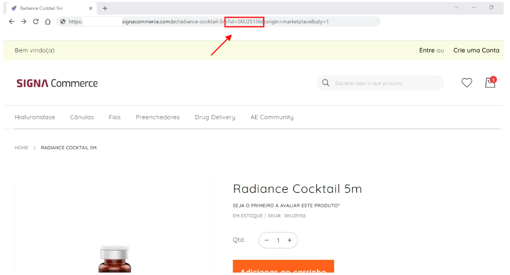 1 - Ao realizar o acesso via loja ou painel administrativo, o cliente irá pegar a url do produto e sku.