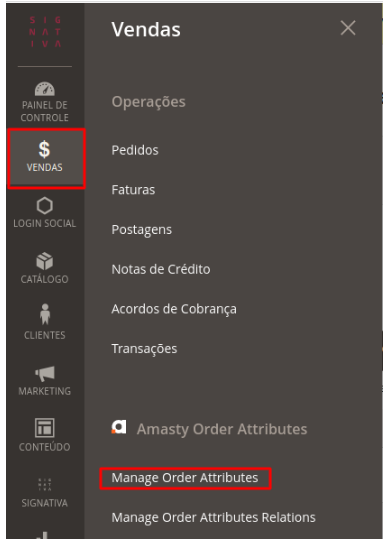 1 - No seu painel administrativo acesse: Vendas > Gerenciar Atributo de Pedido (Manage Order Attributes)