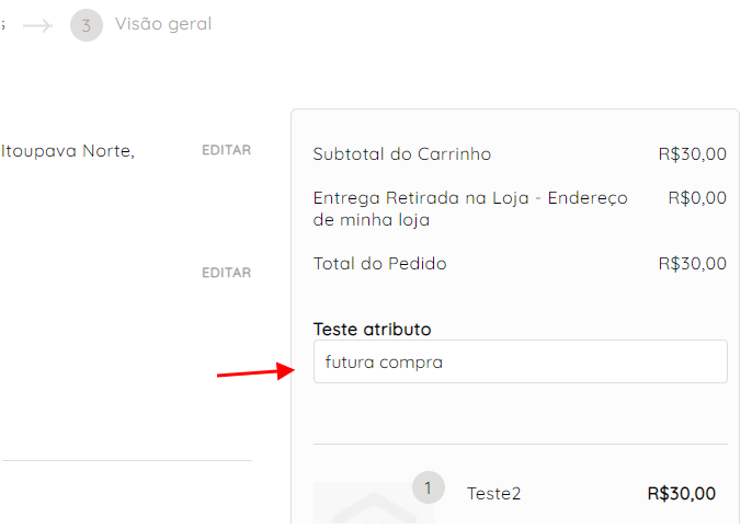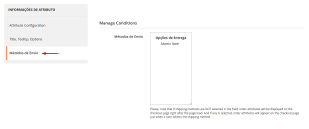 Observação: Se os métodos de envio NÃO foram selecionados no campo, os atributos do pedido serão exibidos na página de checkout logo após o carregamento da página. E se algum for selecionado, os atributos do pedido aparecerão na página de checkout apenas quando um usuário selecionar o método de envio.
