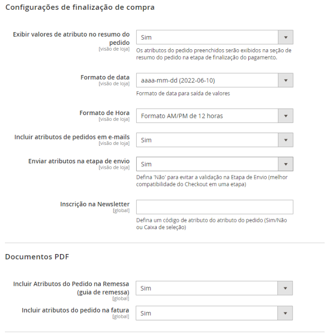 5.6.1 - Lojas > Configurações > Configuração > Extensões Amasty > Atributos do Pedido