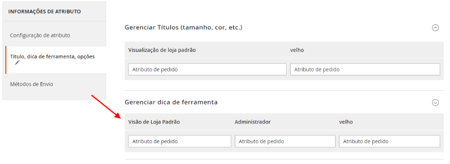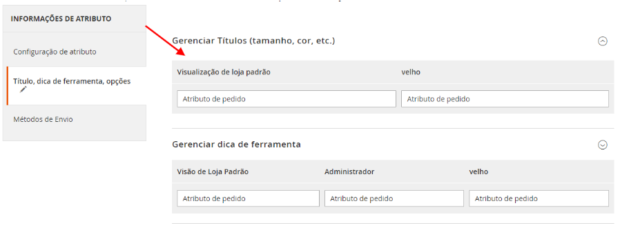 3.1 - Em Título Padrão, adicione um título para o novo atributo que irá criar para o pedido.