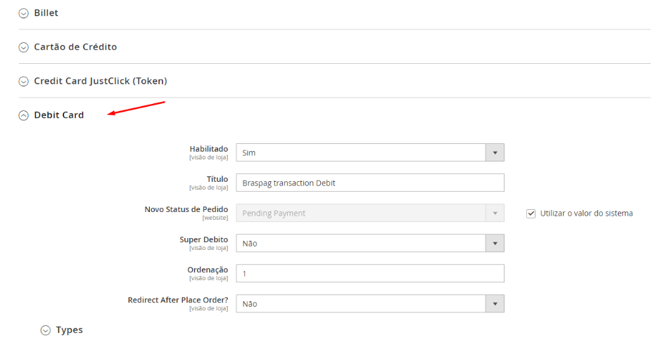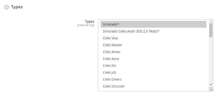 A imagem a seguir mostra o campo de configuração a ser preenchido para cartão de crédito na seção “Types”: