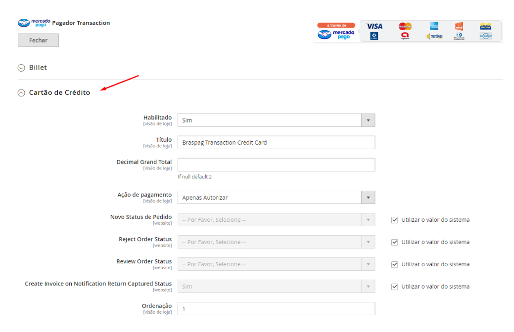 Seguem instruções para acesso e configurações específicas para o método de pagamento Cartão de Crédito: