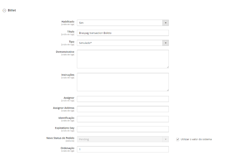 Ativa (“Yes”) ou desativa (“No”) o método de pagamento boleto.