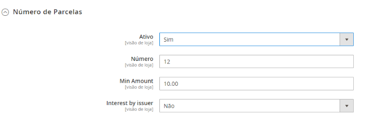 Ativa (“Yes”) ou inativa (“No”) o parcelamento para o método de pagamento cartão de crédito.