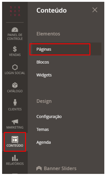 Para o cadastro, acesse em seu painel administrativo: Conteúdo e em seguida clique em Páginas
