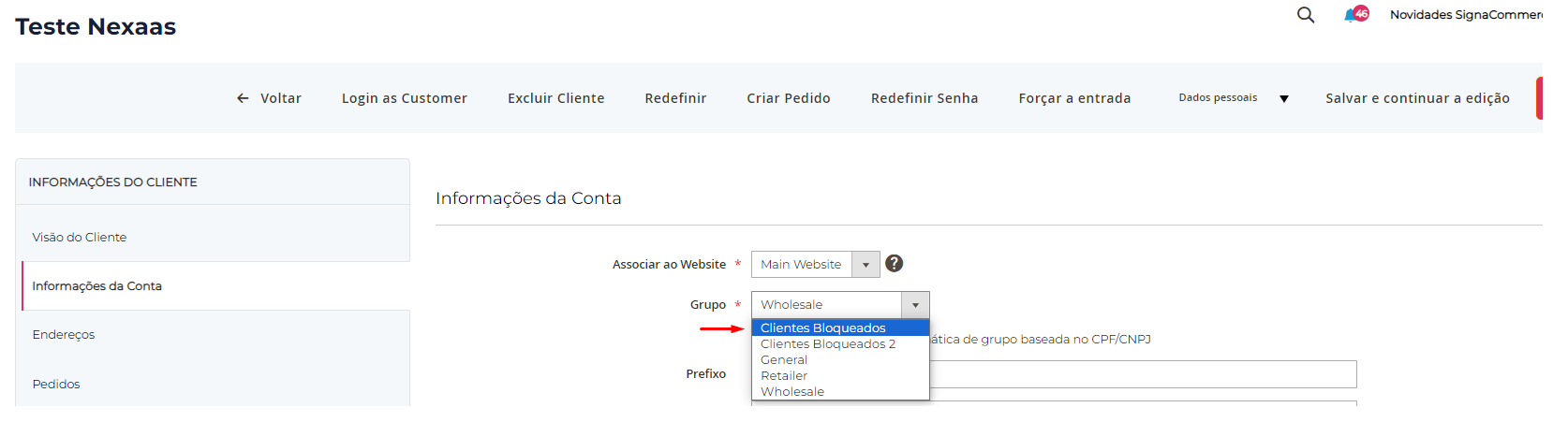 2.2 - Entre no cadastro dos clientes, e em Informações da Conta, altere o grupo do cliente para o grupo “Clientes Bloqueados”.