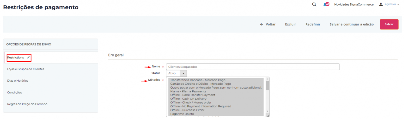 3.2 - Em Restrictions, coloque o nome da regra, troque o status para ativo e selecione todos os métodos de pagamento: