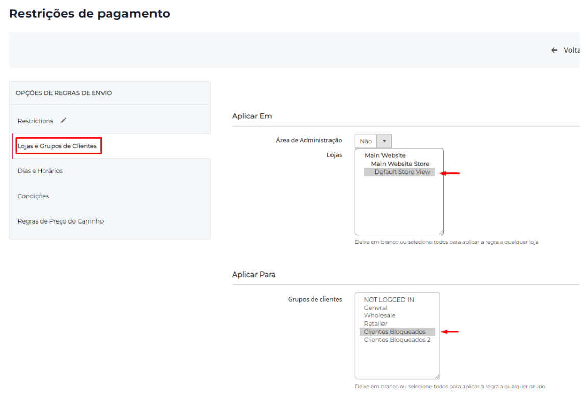 3.3 - Em Lojas e Grupos de Clientes, selecione a loja e o grupo de Clientes Bloqueados: