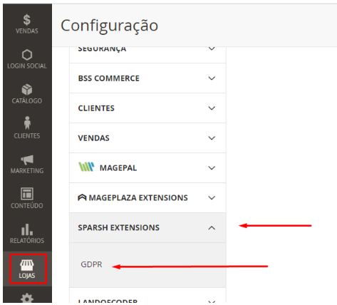 O módulo ficará visível no seguinte caminho: Lojas > Sparsh Extensions > GDPR