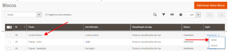 Procure pelo bloco intitulado de Cookie Notice e clique em Editar