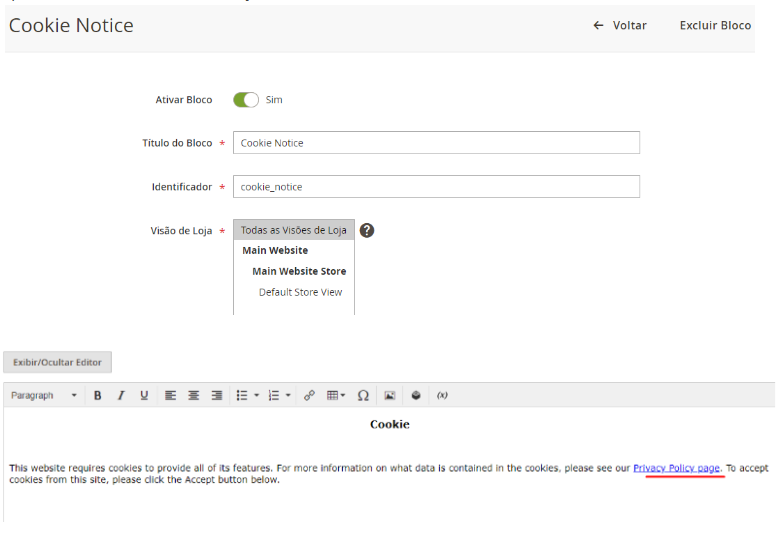 Ao finalizar a edição do texto, deverá ser linkado o trecho "Política de Privacidade" com a página correspondente as politicas da loja.