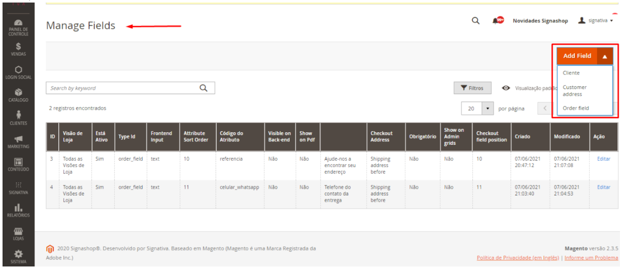 - Para adicionar um campo na finalização de pedido, selecione o "Order Field".