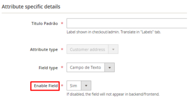 - Insira o título, o tipo do campo (texto, seleção, data e outras informações que forem necessárias), após marque o campo Enable Field como Sim, para manter esse campo habilitado no fronted.