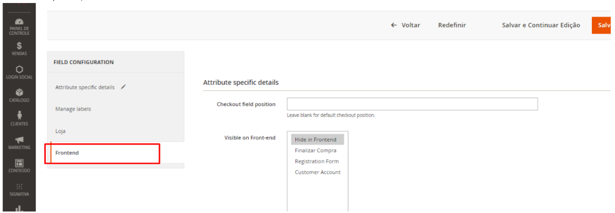 - Na aba ‘Frontend’ preencha as informações de configuração que serão exibidas na loja para o cliente. Nessa tela você pode definir qual grupo de cliente pode visualizar, em que posição no checkout irá aparecer, entre outras.