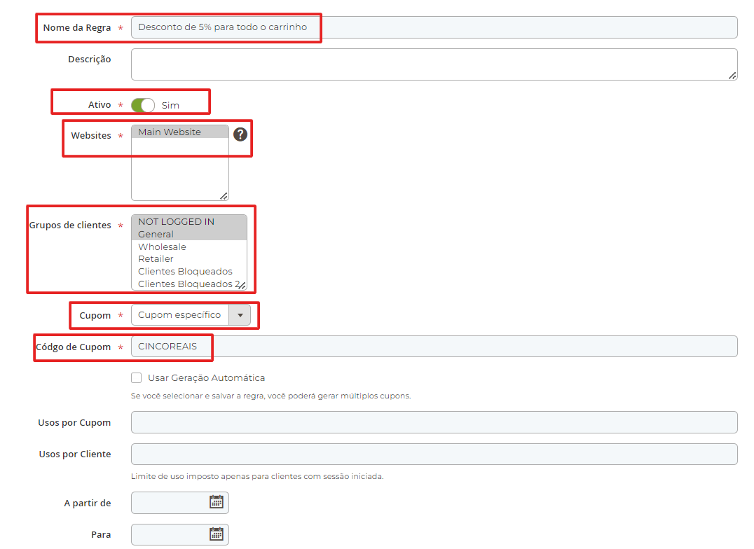 2.1.2 - Vamos usar um código de cupom específico para esta regra. No campo “Cupom” selecione “Cupom Específico” e informe o código “CINCOREAIS".