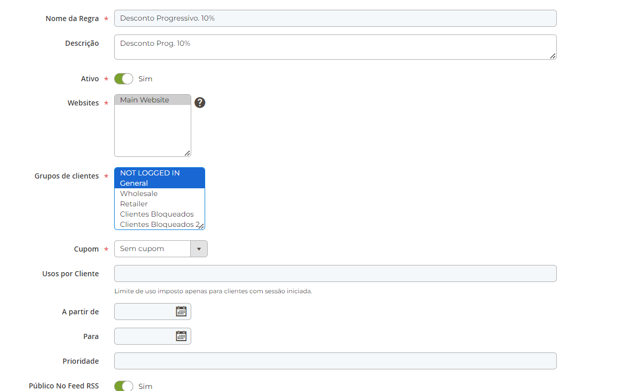 2.1.5 - Grupo de clientes: Selecione o grupo de clientes que poderá utilizar essa regra. Caso não deseje limitar a regra de desconto à um grupo específico de clientes, marque todas as opções