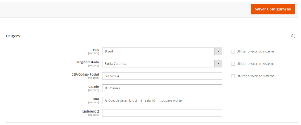 Na aba Origem você irá inserir algumas informações, como: país, estado, cep, cidade e endereço. Esses campos serão utilizados para fazer o cálculo automático dos fretes.