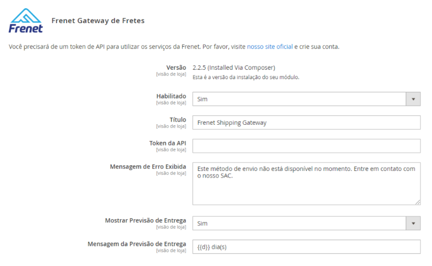 - Em Token da API insira o token disponibilizado pelo Frenet.