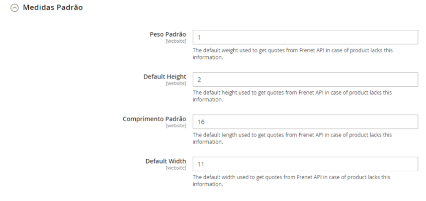 Na aba Medidas Padrão, se quiser que o frete seja calculado de acordo com um valor padrão do Frenet, preencha os campos Peso padrão, Default Height (altura), Comprimento padrão e Default Width (largura).