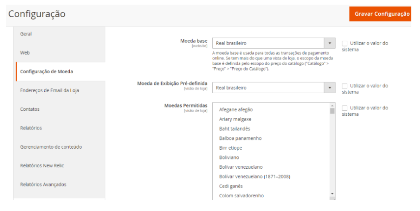 - Altere apenas as opções de moedas para real brasileiro, ou selecione outras moedas que preferir.