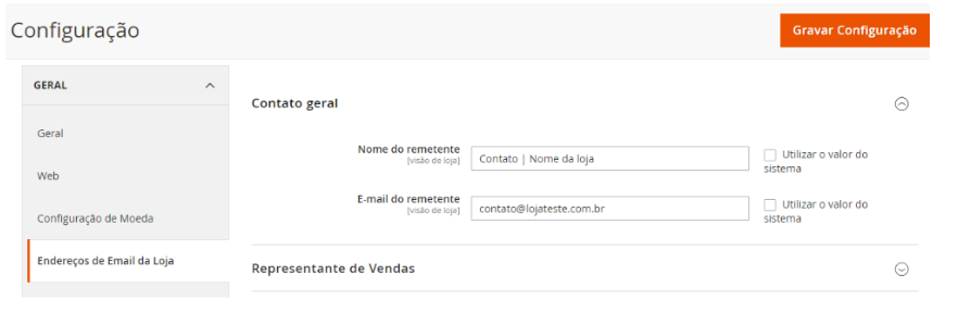 Para adicionar, desmarque o checkbox “Utilizar o valor do sistema” e informe o nome e email desejado, exemplo: