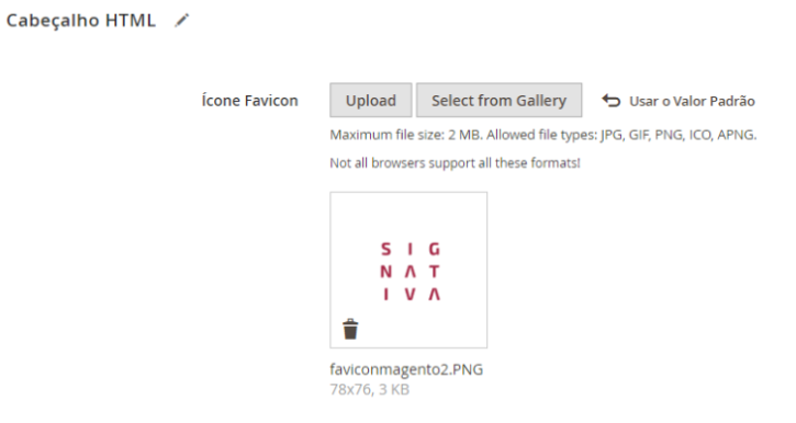 Nesta aba iremos realizar o upload (envio) do ícone favicon. Este ícone é uma pequena imagem que fica ao lado da barra de endereços do navegador com a finalidade de identificação rápida do loja enquanto os clientes navegam em outros sites.