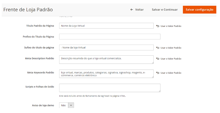 Neste campo iremos realizar o upload (envio) da logo da loja e alterar o texto de boas vindas que ficam disponíveis na home do site, no cabeçalho.
