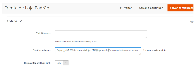 No rodapé iremos alterar os direitos autorais da loja e outros códigos html, se preferir.